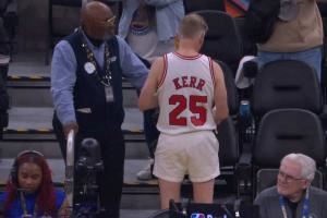 🤣这老古董哪儿找来的啊?有球迷身穿科尔公牛球衣场边观赛