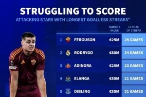 德转盘点进攻球员进球荒:埃文-弗格森25场,罗德里戈24场
