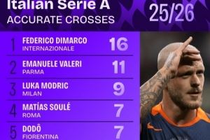 本赛季意甲迪马尔科16次精准传中第一,莫德里奇9次排名第三